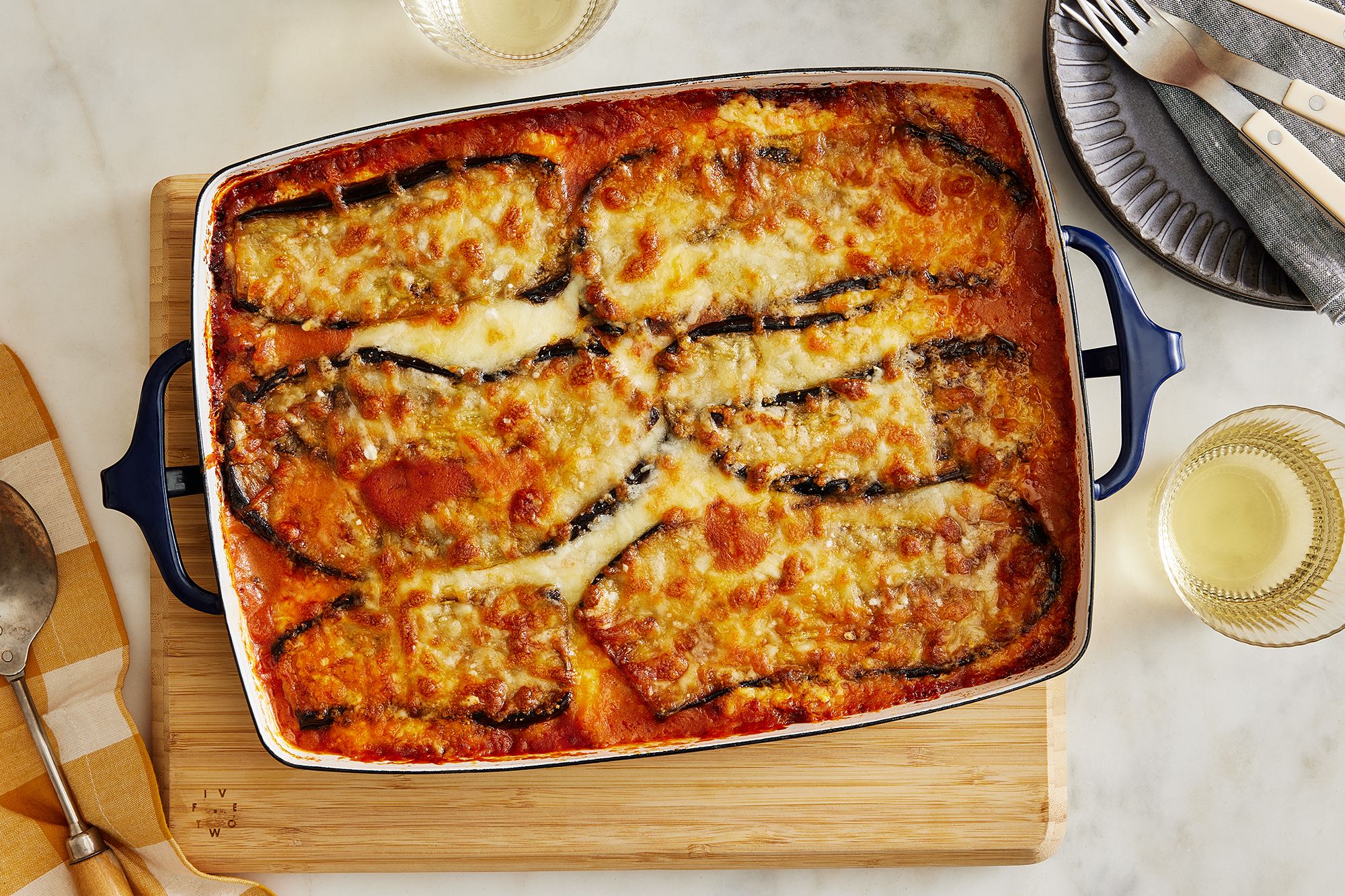 You can prepare the eggplant ahead of time and refrigerate. For a vegetarian version, skip the meat sauce and add sautéed spinach or mushrooms.