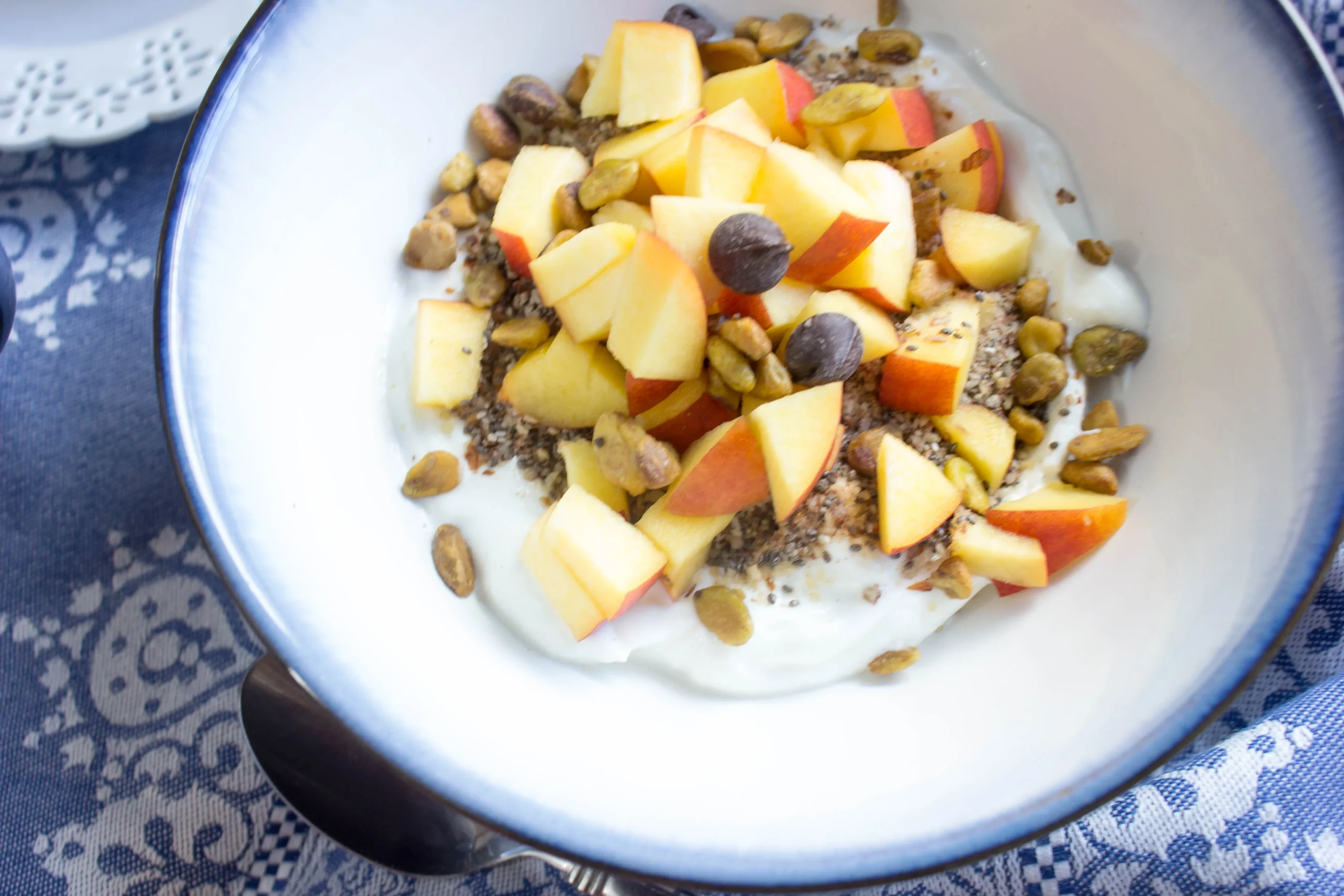 1. In a bowl, mix Greek yogurt (or coconut yogurt) with almond butter and chia seeds until smooth.