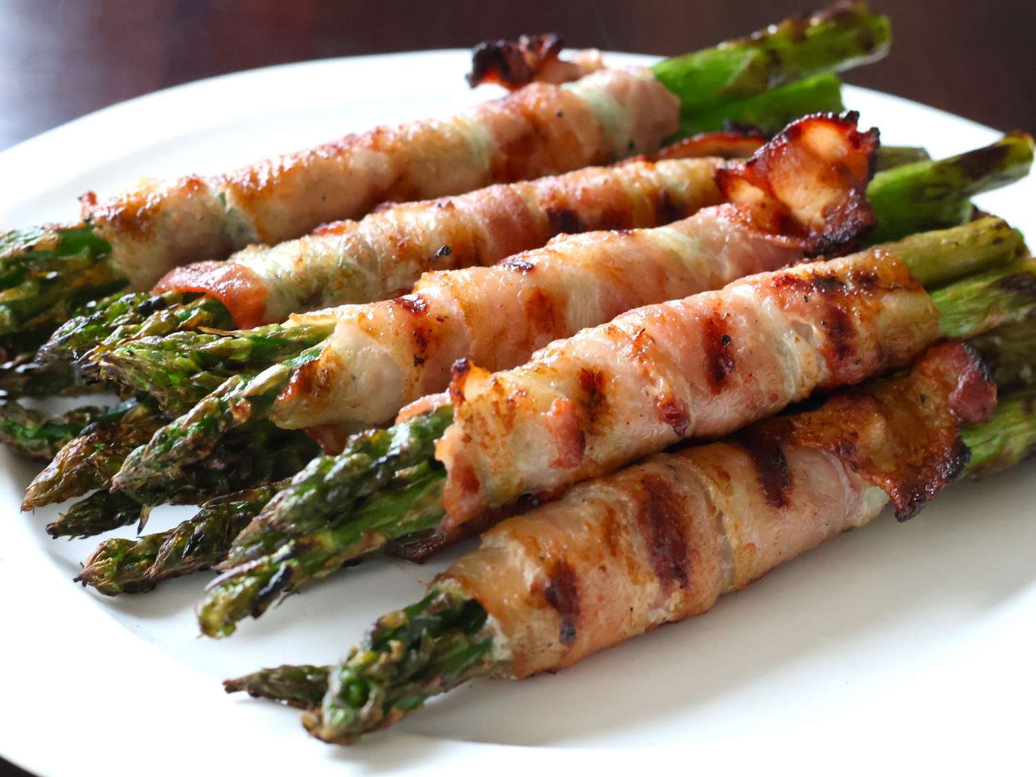 - Wrap small bundles of asparagus (3–4 stalks each) with bacon slices.