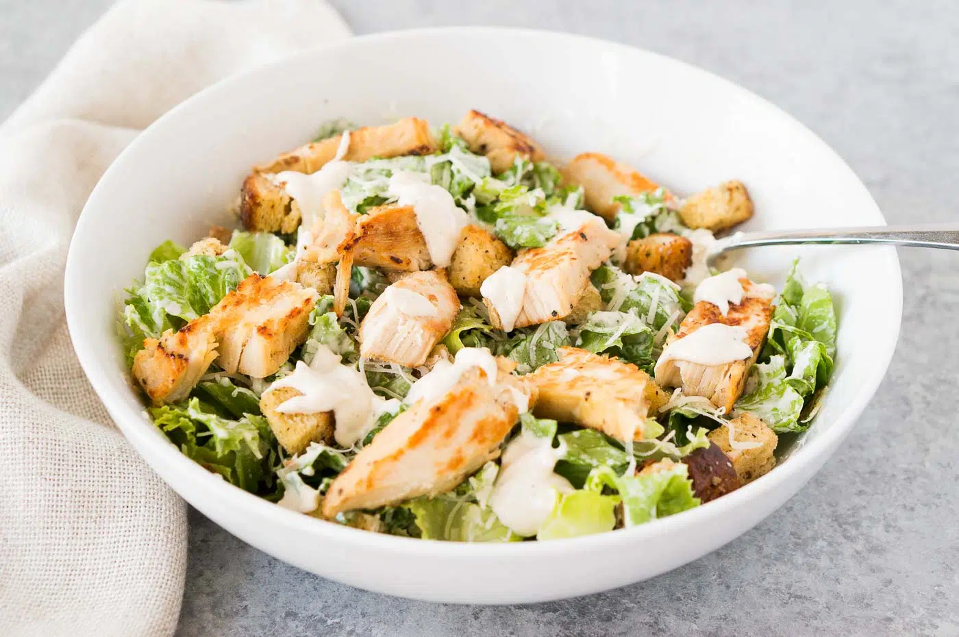 A low-carb salad bowl loaded with juicy grilled chicken, crisp romaine lettuce, parmesan, and a creamy keto Caesar dressing.