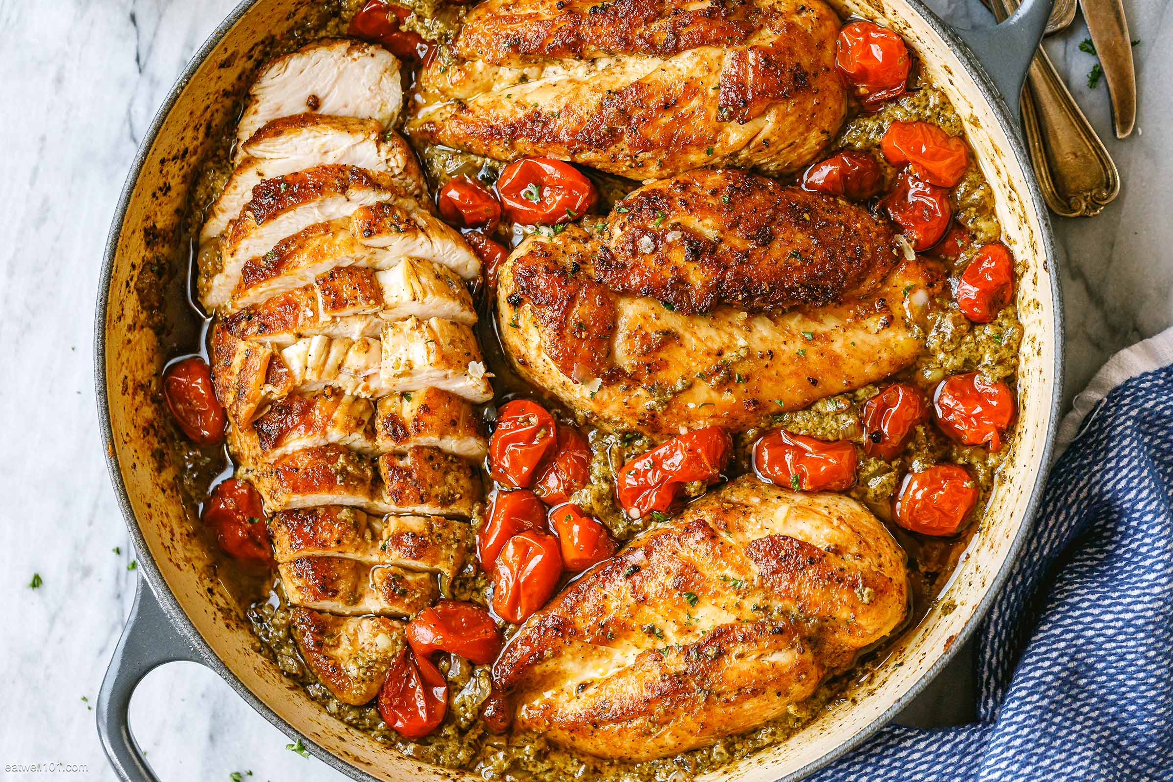 2. Add pesto and heavy cream to the skillet, stirring until chicken is coated in a creamy sauce.