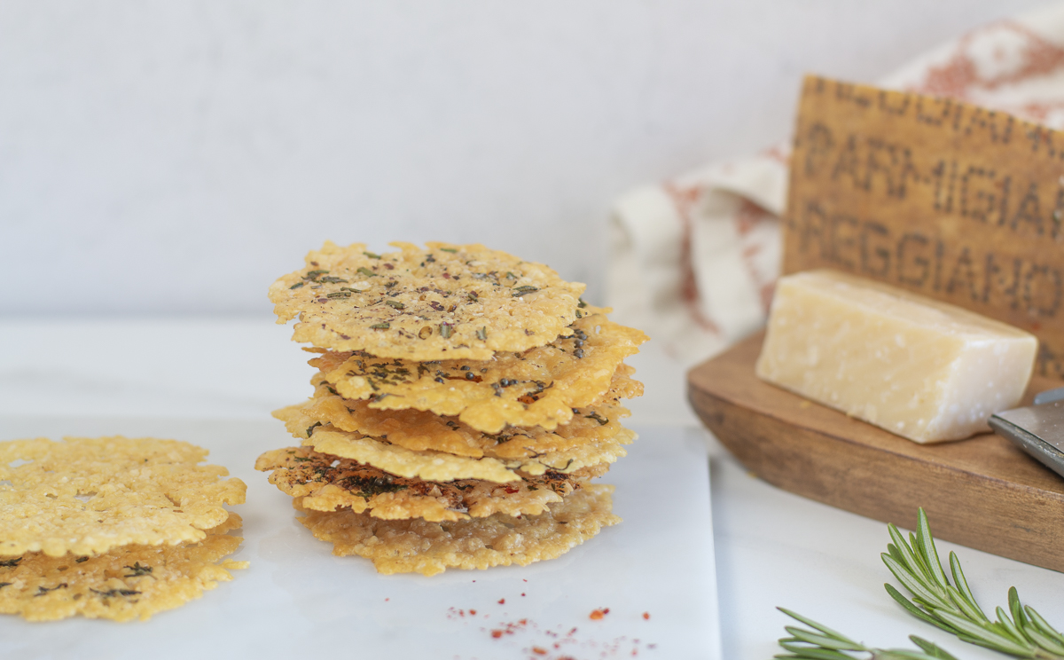Each crisp is baked to golden perfection, combining Parmesan cheese, rosemary, and thyme — with just a hint of chili flakes for a subtle kick.