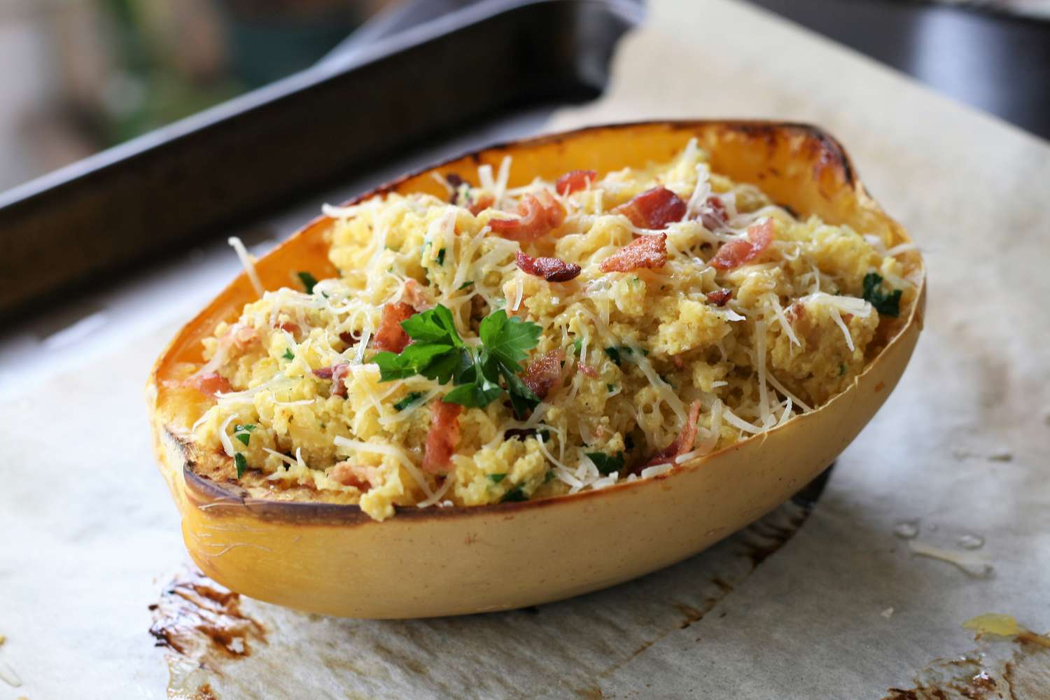 A creamy, cheesy low-carb take on the classic carbonara, made with roasted spaghetti squash instead of pasta.